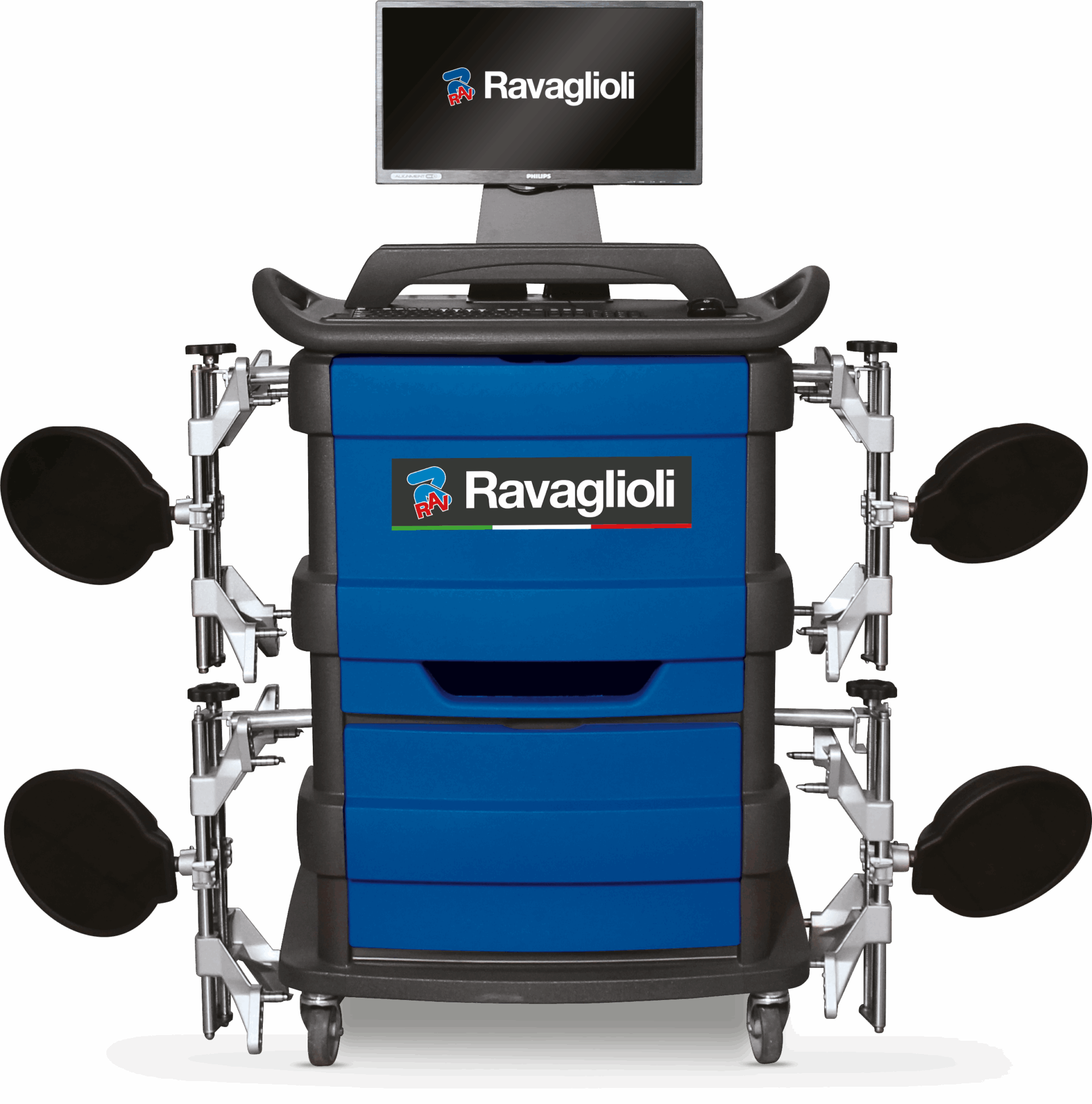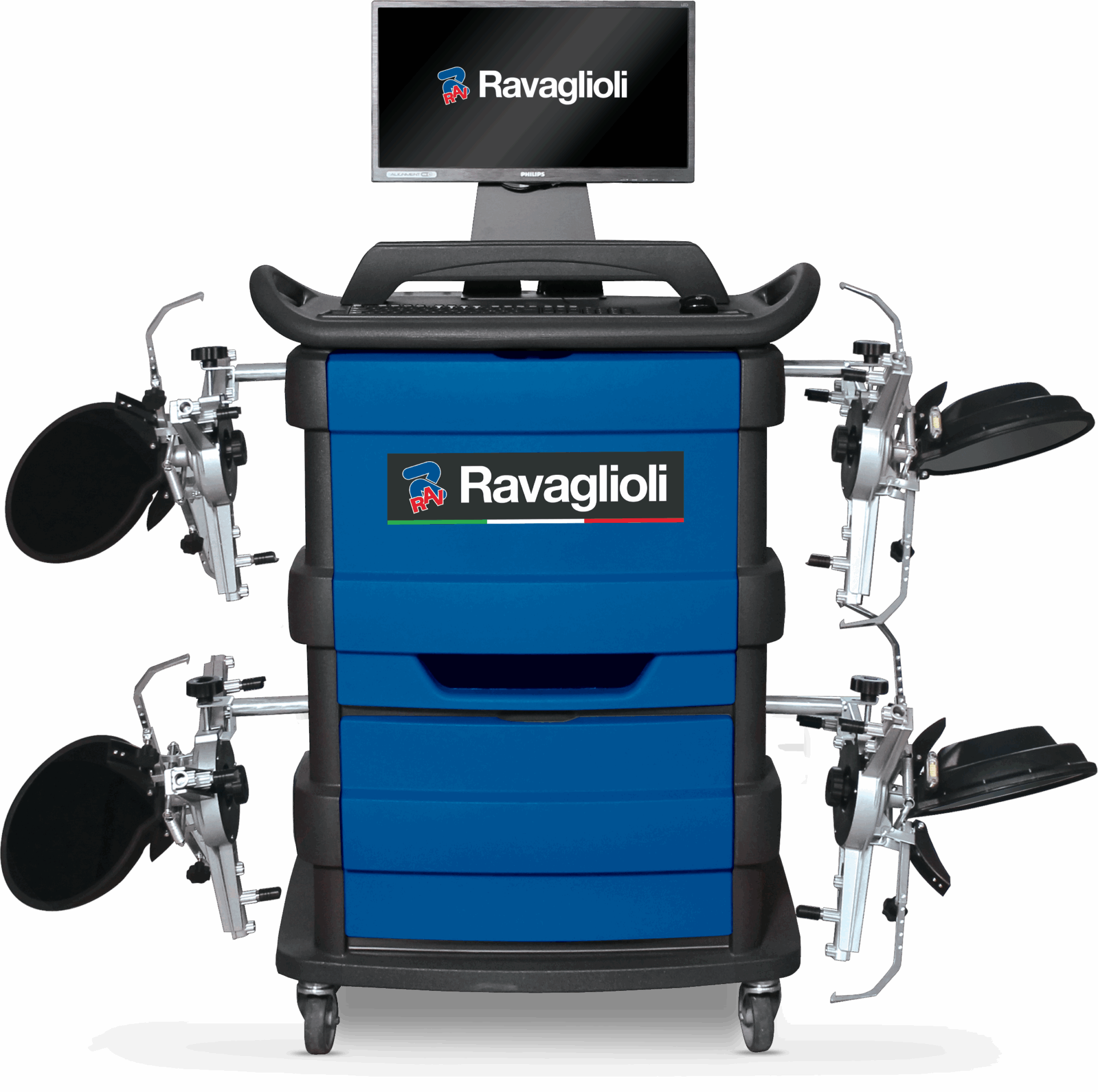 Dispositivo de alineación de ruedas 3D con captadores de medición 3D con resolución HQ y comunicación de datos mediante Bluetooth | incl. garras de 3 puntos con autocentrado, TFT pantalla 22″ y consola cerrada | Azul (RAL 5005)