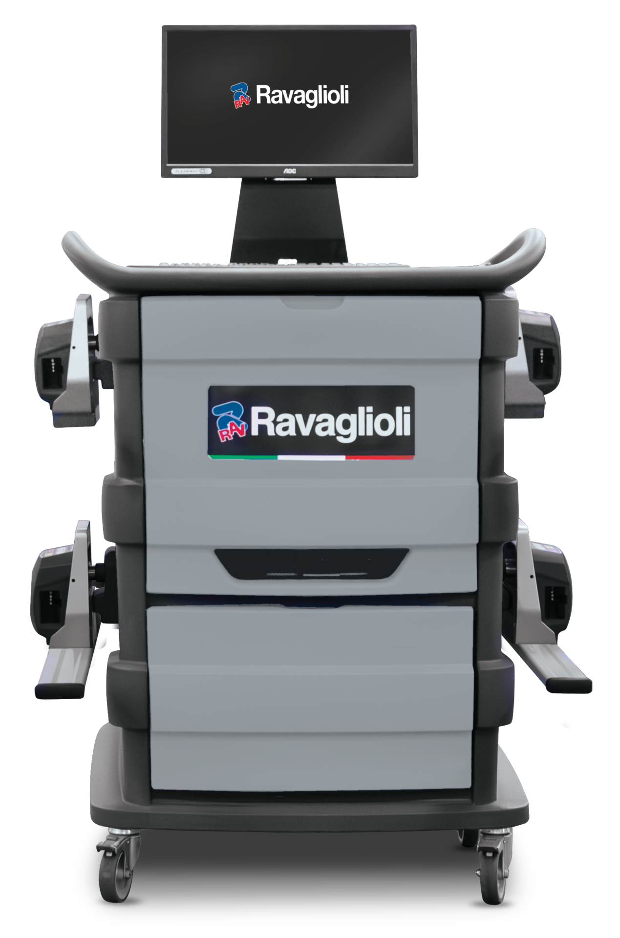 Appareils de géométrie de roues équipés de capteurs CCD avec transmission des données via Bluetooth et alimentés par batteries à charge rapide. Le meuble monté sur roulettes permet une grande mobilité entre plusieurs postes de travail grâce à l’absence totale de câbles.