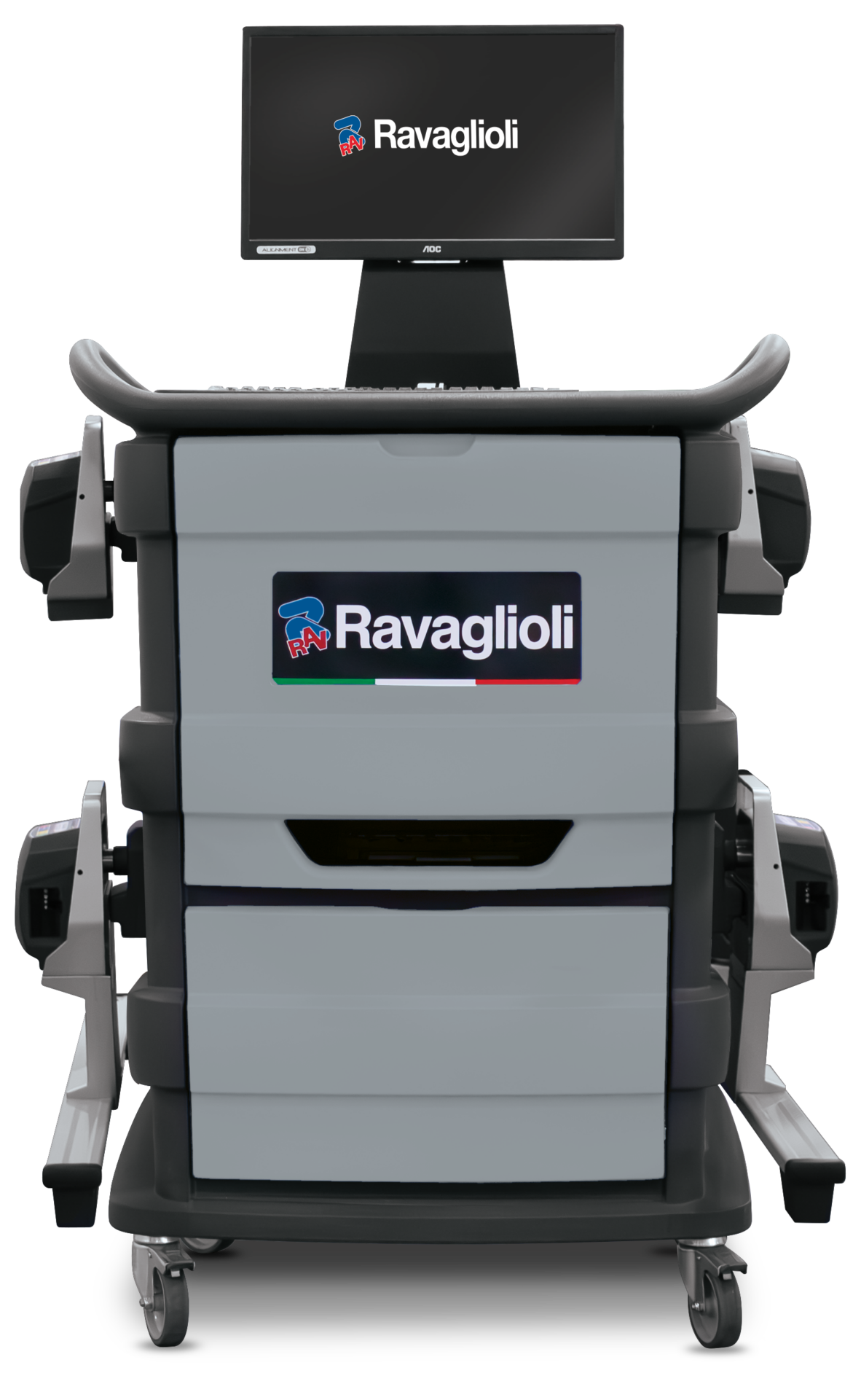 Appareils de géométrie de roues équipés de capteurs CCD avec transmission des données via Bluetooth et alimentés par batteries à charge rapide. Le meuble monté sur roulettes permet une grande mobilité entre plusieurs postes de travail grâce à l’absence totale de câbles.
