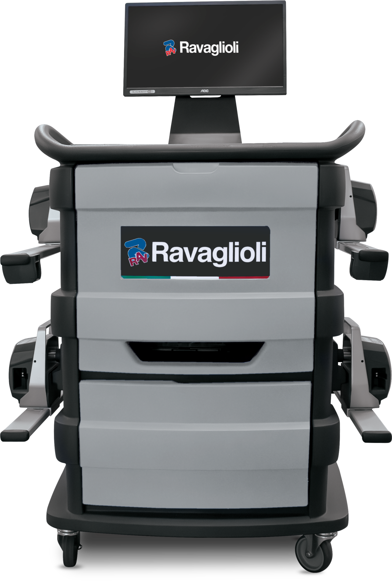 Appareils de géométrie de roues équipés de capteurs CCD avec transmission des données via Bluetooth et alimentés par batteries à charge rapide. Le meuble monté sur roulettes permet une grande mobilité entre plusieurs postes de travail grâce à l’absence totale de câbles.