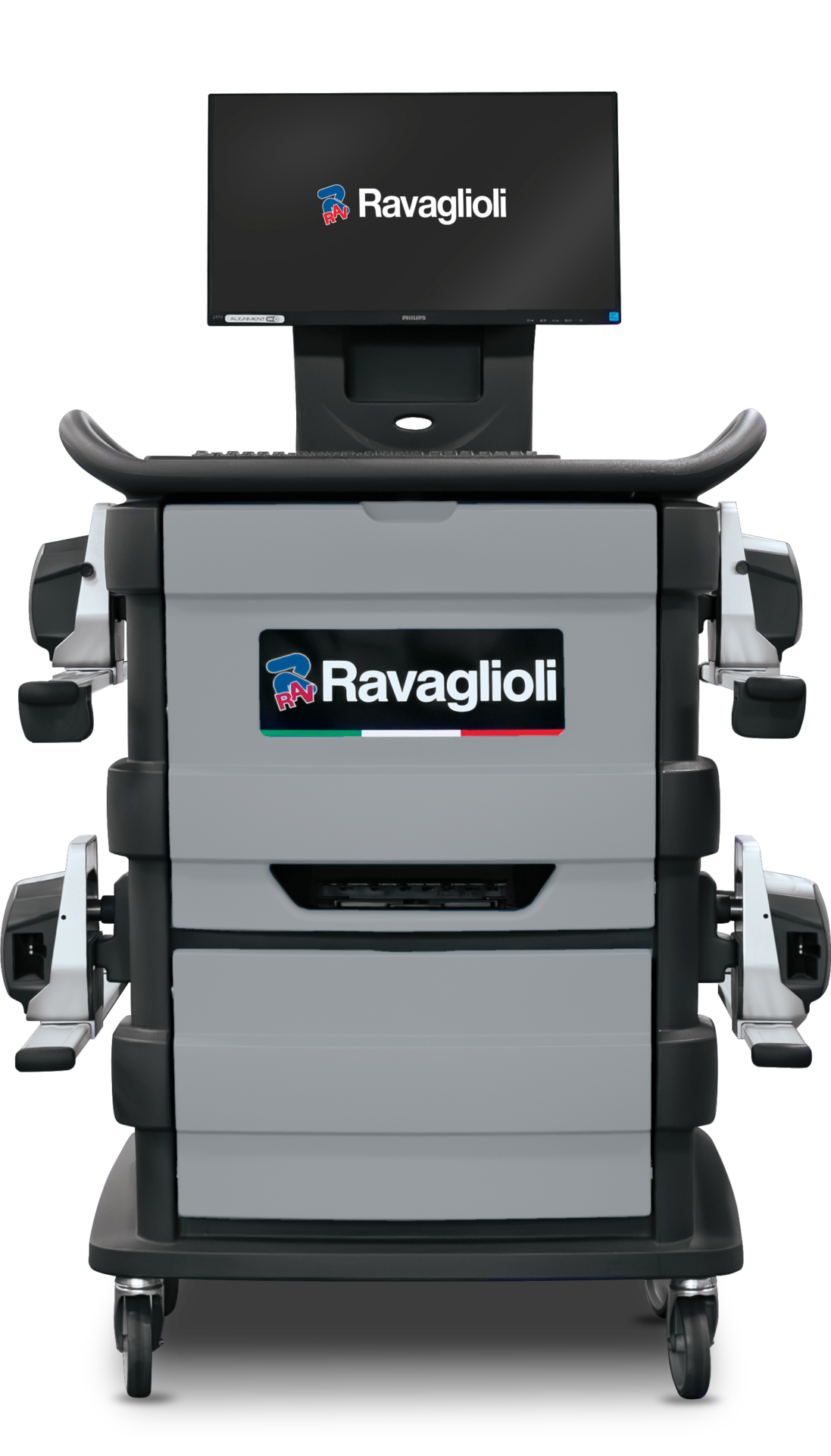 Appareils de géométrie de roues équipés de capteurs CCD avec transmission des données via Bluetooth et alimentés par batteries à charge rapide. Le meuble monté sur roulettes permet une grande mobilité entre plusieurs postes de travail grâce à l’absence totale de câbles.