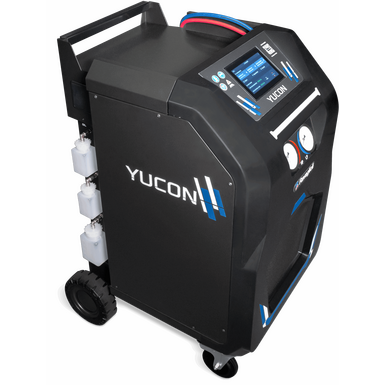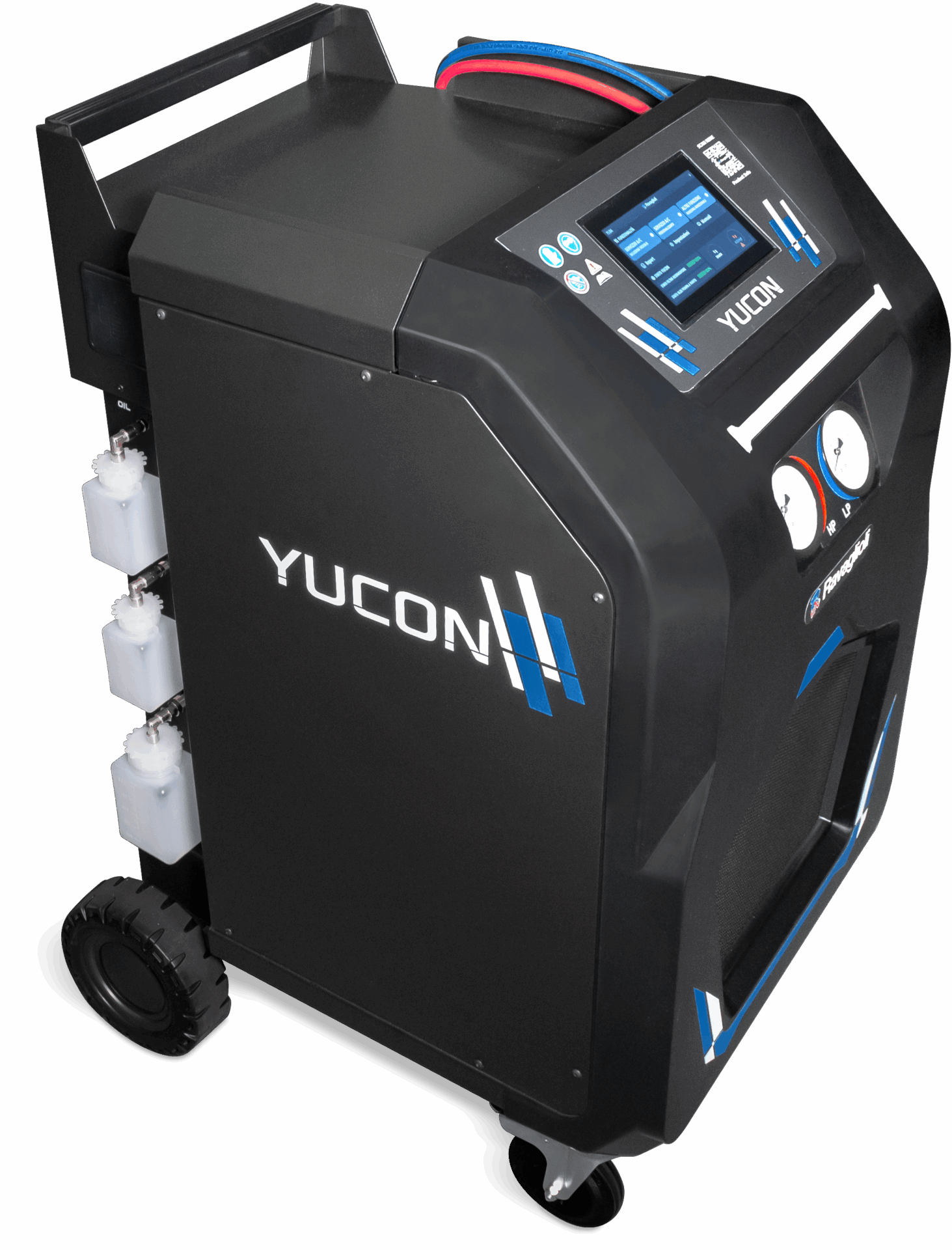 Yucon est une station de service entièrement automatique pour la récupération, le recyclage et la charge des gaz réfrigérants des systèmes de climatisation auto.