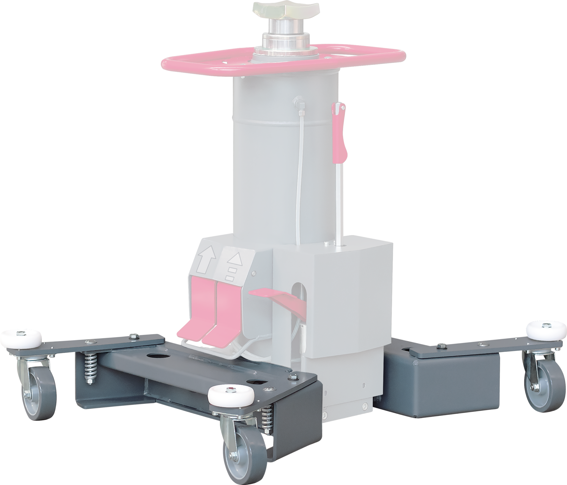 - I cuscinetti a rullini montati nelle rotelle del telaio consentono di spostare il sollevatore senza sforzo all’interno della fossa. Tutti i telai M e X si abbassano automaticamente quando vengono caricati con un carico superiore a 0,8 t.
