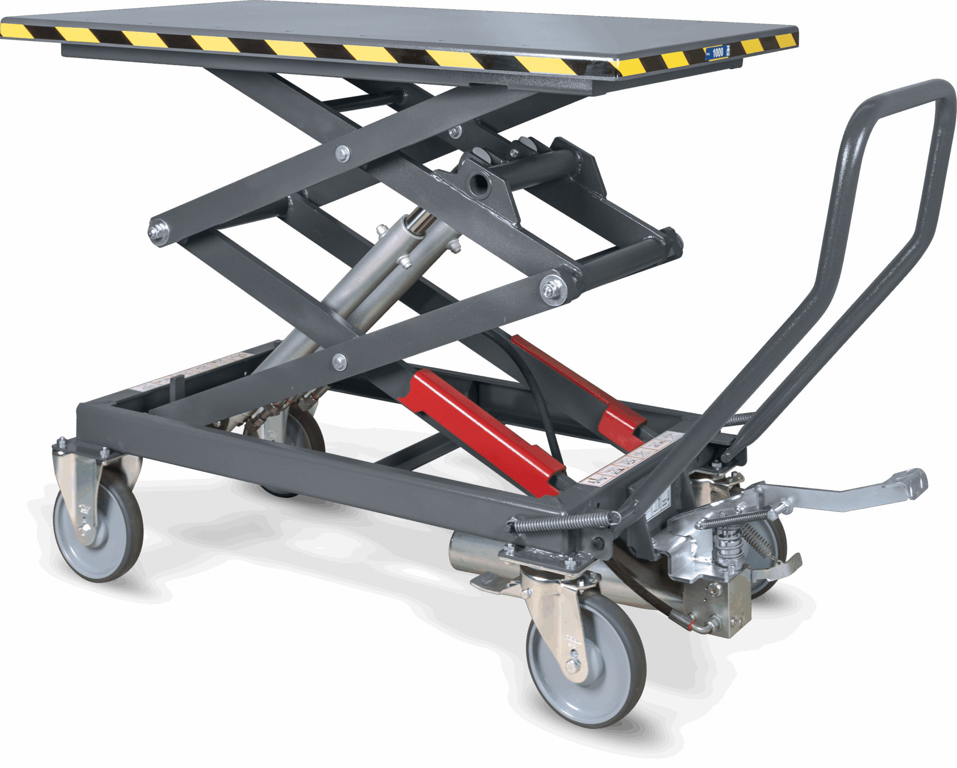- The hydraulically controlled lifting load stroke is activated by foot, using a double acting pump that ensures the lifting of any load quick and effortless.