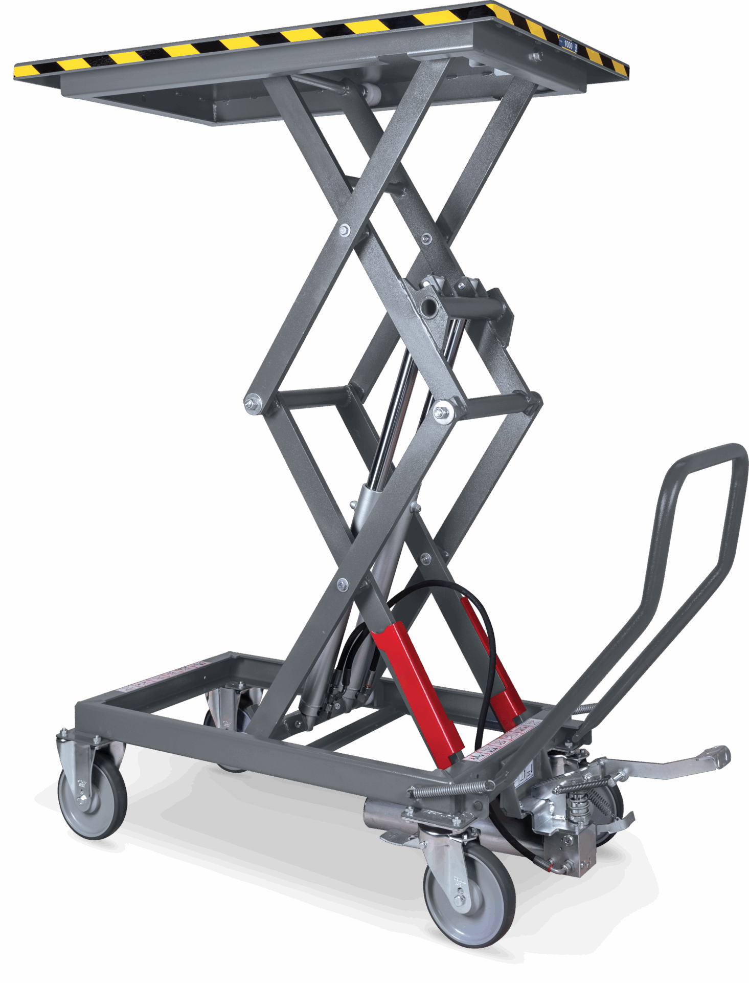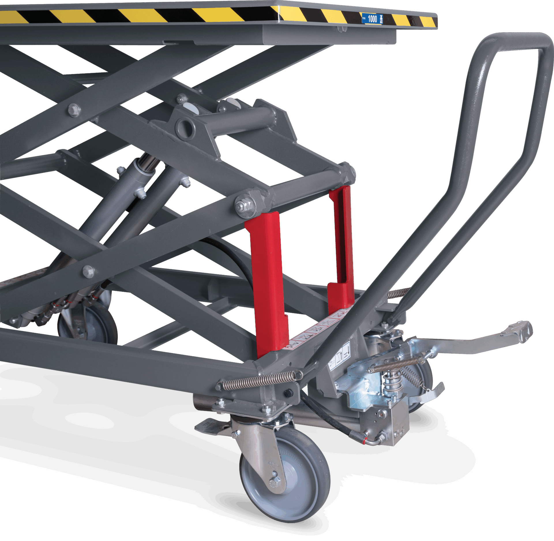 • The hydraulically controlled lifting load stroke is activated by foot, using a double acting pump that ensures the lifting of any load quick and effortless.