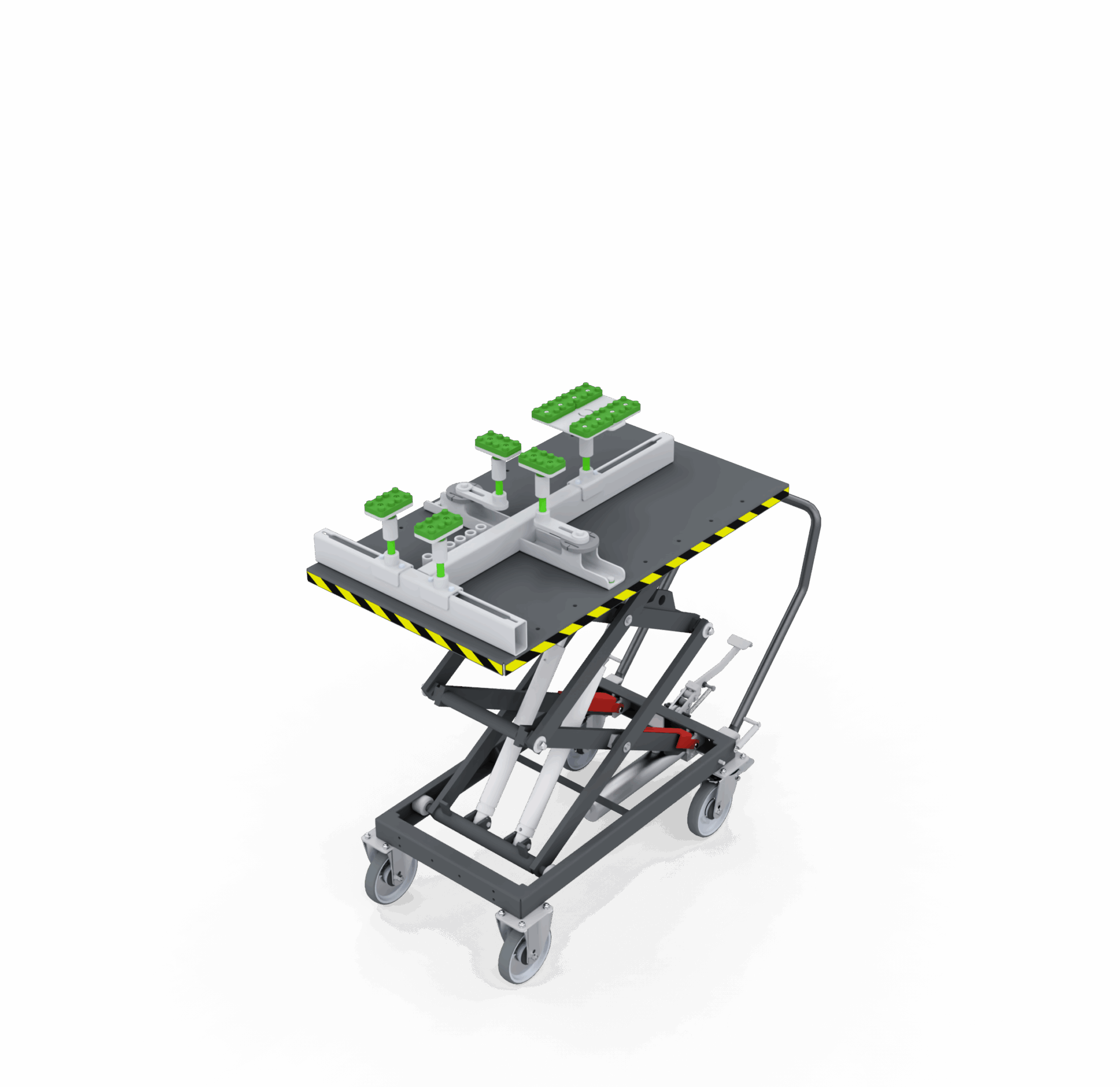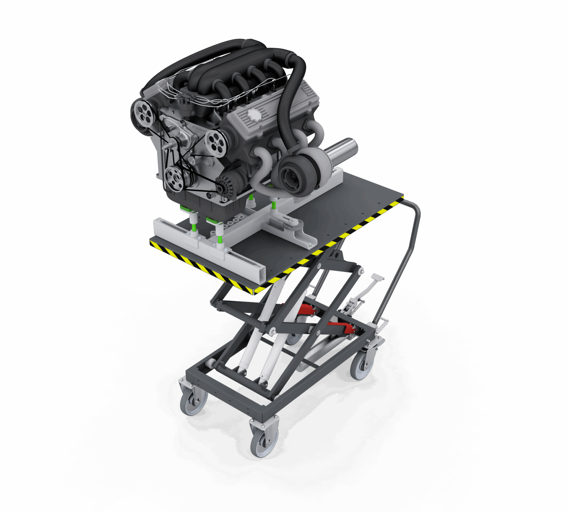 Universal lifting table with a load capacity up to 1 t. Suitable for easy and safe removal and installation of engines, gearboxes, HV batteries, and chassis components. Developed on the basis of 20 years of experience as a manufacturer of lifting tables in cooperation with leading car manufacturers.